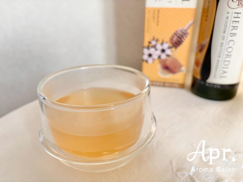 サロンでは、マヌカハニーのコーディアルとホーリーバジルティーなどお召し上がりいただいています。
